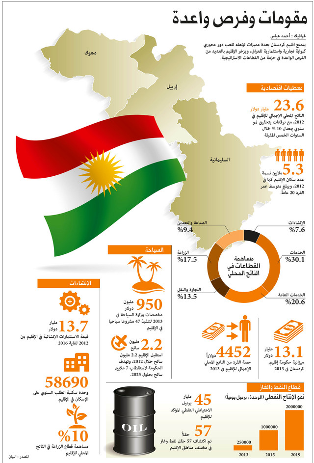 وأضاف: «نبحث باستمرار عن حلول لضمان مواصلة التنمية الاقتصادية في الاقليم، ويشكل القطاع الخاص إلى جانب الاستثمار الأجنبي، ومن ضمنه الاستثمار الإماراتي، مساهماً أساسياً في تحقيق هذا الهدف، كما نهدف إلى تعزيز مقومات الاقليم المتنوعة، خاصة في ظل الأمن والاستقرار بالإضافة إلى توافر الأيدي العاملة، حيث تبلغ نسبة البطالة في الاقليم 6% في الربع الأول من 2014 وهي من أفضل المعدلات على المستوى الاقليمي».