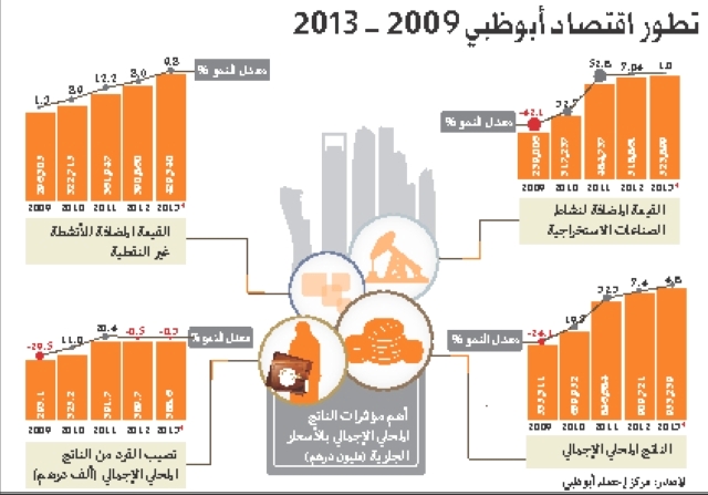 وذكر التقرير أن الأنشطة غير النفطية شهدت ارتفاعاً قوياً العام الماضي كما تشير البيانات إلى أن هذه الأنشطة شهدت نمواً موجباً ملحوظاً خلال السنوات الثلاث الماضية بعد النمو المتواضع في عام 2010 الذي بلغ 1.3 ٪ حيث ارتفعت القيمة المضافة للأنشطة غير النفطية بالناتج المحلي الإجمالي للإمارة إلى 429.34 مليار درهم خلال 2013 مقابل 296.31 مليار درهم في عام 2009 بنمو إجمالي خلال 5 سنوات بلغ مقداره 133.04 مليار درهم بنسبة نمو تراكمية في السنوات الخمس بلغت 44.9 ٪.