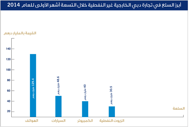 درهم، وبلغت قيمة التجارة بأجهزة الكمبيوتر خلال هذه الفترة نحو 40 مليار درهم بنمو 10%، ، وبلغت قيمة التجارة بالزيوت النفطية 30.5 مليار درهم بنمو 12%.