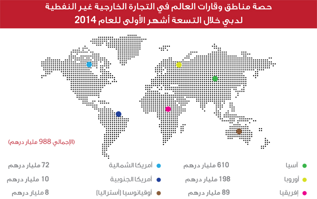 تمكنت دبي من الحفاظ على القيمة المرتفعة لتجارتها الخارجية خلال الأشهر التسعة من يناير إلى سبتمبر من العام 2014 مقتربة من التريليون درهم، وذلك وفق أحدث إحصائيات جمارك دبي، التي أوضحت أن تجارة دبي الخارجية غير النفطية بلغت قيمتها خلال هذه الفترة 988 مليار درهم، توزعت إلى الواردات بقيمة 621 مليار درهم، والصادرات بقيمة 86 مليار درهم، وإعادة التصدير بقيمة 280 مليار درهم، وذلك رغم تأكيد البنك الدولي أن أسعار السلع الأساسية شهدت انخفاضاً مستمراً في العام 2014.