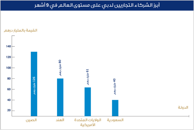 وقال سلطان أحمد بن سليم رئيس مؤسسة الموانئ والجمارك والمنطقة الحرة، رئيس موانئ دبي العالمية:" حققت تجارة دبي الخارجية مع عدد من الشركاء التجاريين الأساسيين نمواً قوياً في الأشهر التسعة الأولى من العام 2014، حيث عززت الإمارة دورها كمنصة أساسية لتجارة العالم مع الصين التي تتربع حالياً على عرش التجارة العالمية، وقفزت قيمة التبادل التجاري بين دبي والصين - وهي الشريك التجاري الأول للإمارة - بنسبة 27% لتصل إلى 126 مليار درهم، وجاءت الهند في مركز الشريك التجاري الثاني بقيمة 80 مليار درهم والولايات المتحدة الأمريكية في مركز الشريك التجاري الثالث بقيمة 61 مليار درهم، والسعودية في مركز الشريك التجاري الرابع عالمياً والأول عربياً بقيمة 40 مليار درهم، بينما قفزت التجارة مع ألمانيا بنسبة 25% لتصل قيمتها إلى 32.5 مليار درهم، وحققت تجارة دبي مع اليابان نمواً بنسبة 13% لتصل قيمتها إلى 31 مليار درهم".