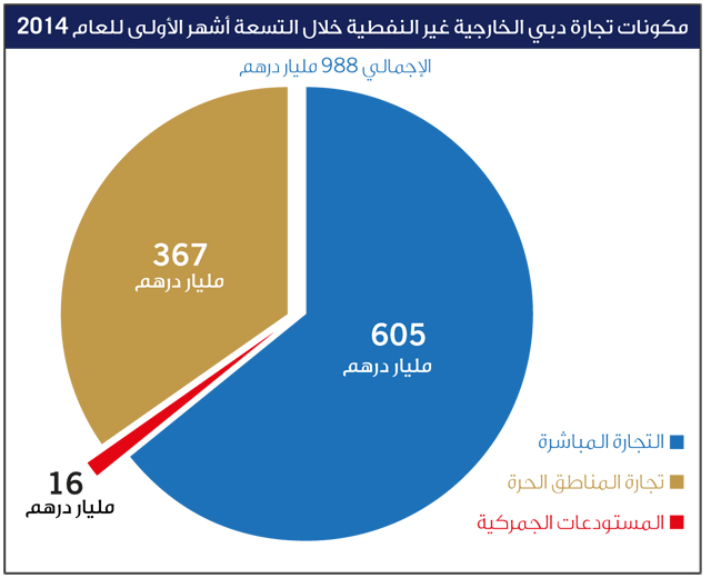 وتوزعت تجارة دبي الخارجية في الأشهر التسعة الأولى من العام 2014 إلى التجارة المباشرة بقيمة 605 مليار درهم، وتجارة المناطق الحرة بقيمة 367 مليار درهم، وتجارة المستودعات الجمركية بقيمة 16 مليار درهم.