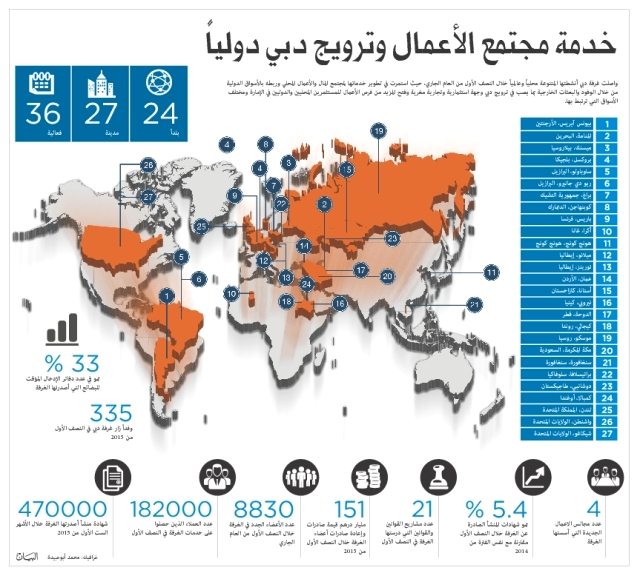 وقد عززت غرفة دبي خلال النصف الأول من العام الحالي وجودها الخارجي لتعزيز تنافسية أعضائها في الأسواق الخارجية، حيث أنهت ترتيبات افتتاح مكتبين إضافيين في كل من موزمبيق والبرازيل، وسيجري افتتاحهما رسمياً في القريب العاجل، بعد أن افتتحت بداية العام الحالي رابع مكاتبها التمثيلية في العاصمة الغانية أكرا متابعةً بذلك تطبيق استراتيجيتها الجديدة الهادفة لفتح أسواق نموٍ جديدة لأعضائها، وتعريف أعضائها بالفرص الاستثمارية المجزية وغير المكتشفة في هذه الأسواق الجديدة.