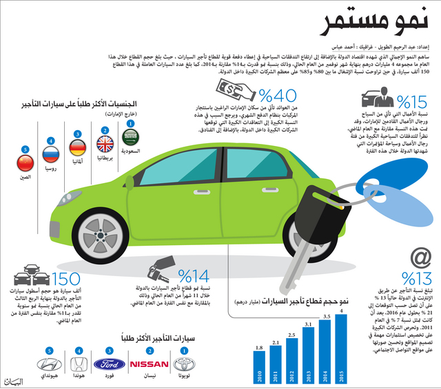 من جانبه تحدث أشيش ناندا، المدير العام لشركة شيفت ليسينغ، التابعة لمجموعة عبد الواحد الرستماني، أن أسطول شركات تأجير السيارات بالدولة خلال العام الحالي يتألف من 150 ألف سيارة بنسبة نمو سنوية تقدر بـ11% مقارنة مع العام الماضي، متوقعاً ان تستمر هذه النسبة في النمو خلال العام المقبل، قياساً بالمؤشرات العامة لنمو الاقتصاد الإماراتي والعالمي على حد سواء، إضافة إلى التوقعات التي تشير إلى نمو قطاع السياحة بنسب تقارب 9%.