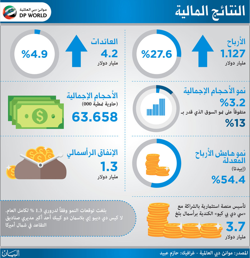 وقالت الشركة في بيان أمس، إن عائداتها ارتفعت 4.9%، لتبلغ 4.163 مليارات دولار، مقابل 3.968 مليارات دولار قيمة العائدات في العام السابق له، مدعومة بمساهمة المنطقة الحرة لجبل علي في الإمارات، و«برنس روبرت» في كندا في نتائج العام كاملاً. وأوضح بيان الشركة، أن التدفقات النقدية من الأنشطة التشغيلية زادت إلى 2.002 مليار دولار، من 1.928 مليار دولار في عام 2015.