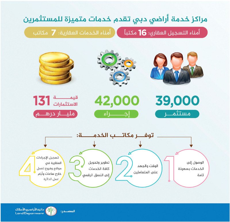 أعلنت دائرة الأراضي والأملاك في دبي، أن مراكز الخدمة التابعة لها والمنتشرة في جميع أنحاء دبي، تمكنت من تقديم خدماتها إلى ما يزيد على 39 ألف مستثمر، بعد أن ساعدتهم على إتمام استثمارات زادت قيمتها على 131 مليار درهم، خلال الفترة الممتدة من يناير وحتى 31 أغسطس 2018.
