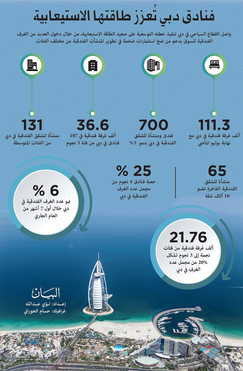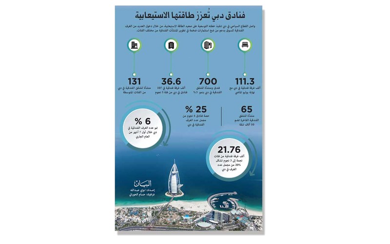 واصل القطاع السياحي في دبي تنفيذ خطته التوسعية على صعيد الطاقة الاستيعابية، من خلال دخول العديد من الغرف الفندقية للسوق بدعم من ضخ استثمارات ضخمة في تطوير المنشآت الفندقية من مختلف الفئات.