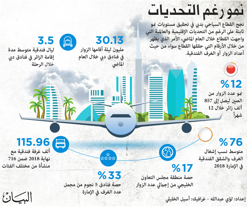 كشفت دائرة السياحة والتسويق التجاري بدبي (دبي للسياحة) عن آخر الإحصاءات الخاصة بأعداد الزوّار الدوليين لدبي لعام 2018، حيث استقبلت الإمارة حوالي 15,92 مليون زائر دولي لليلة واحدة، الأمر الذي يؤكد قوة جاذبيتها وجهة عالمية مفضّلة، إذ ساهمت الأسواق الرئيسية لدبي في تحقيق نمو ملحوظ في أعداد الزوار القادمين منها بما يعزّز من قطاع السياحة لتحقيق أهداف الاستراتيجية السياحية 2022-2025 الرامية إلى استقبال المزيد من الزوّار الدوليين سنوياً بحلول 2025، فضلاً عن زيادة مساهمته في الناتج المحلي الإجمالي لدبي.