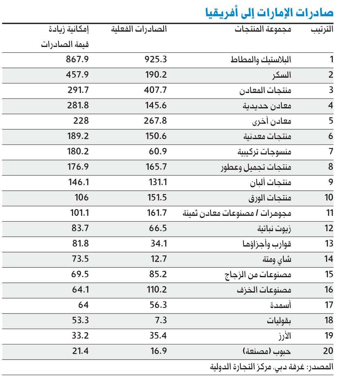 ألقت غرفة صناعة وتجارة دبي الضوء على الإمكانات غير المستغلة لصادرات الإمارات إلى أفريقيا، وذلك من خلال تحليل حديث أعدته الغرفة بناءً على تقرير «فرص الصادرات غير المستغَلة» والصادر عن مركز التجارة الدولية، وذلك على هامش استعدادات غرفة دبي لتنظيم الدورة الخامسة من المنتدى العالمي الأفريقي للأعمال في دبي في نوفمبر المقبل. وسجّلت صادرات الإمارات إلى الدول الأفريقيّة معدلات نمو جيدة على مدى العقد الماضي، وأكّدت قراءات غرفة دبي إمكانية مضاعفة هذه الصادرات في معظم فئات المنتجات في المستقبل، وذلك في ظل حفاظ الإمارات على جهودها المستمرة في تطوير وضعها كمركز تجاري لتصدير المنتجات إلى الأسواق الأفريقيّة.