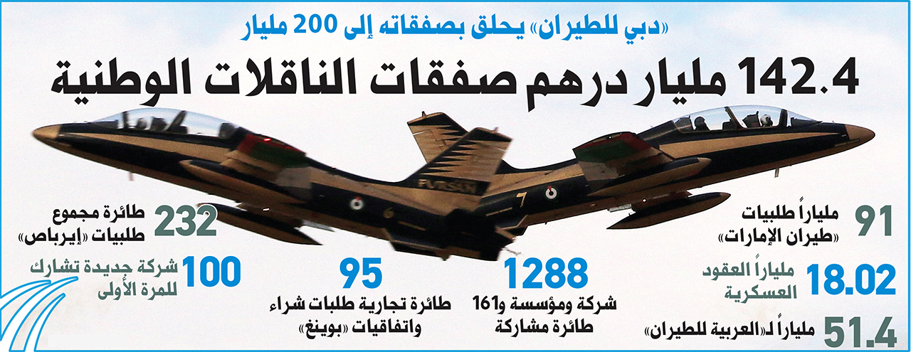 وبلغ حجم صفقات الناقلات الوطنية خلال المعرض 142.4 مليار درهم موزعة بين صفقات لطيران الإمارات بقيمة 91 مليار درهم و51.4 مليار درهم حجم صفقة العربية للطيران.