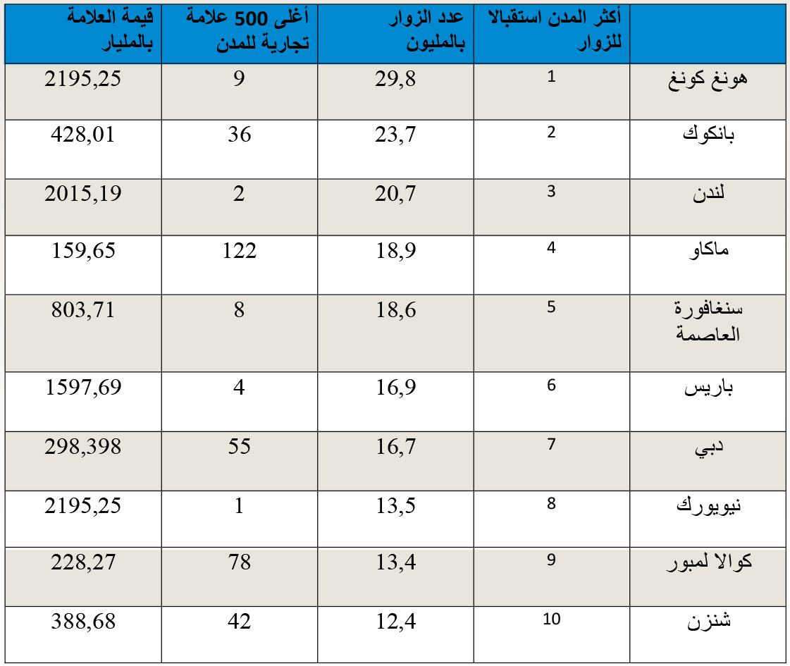 وكانت أكثر ست مدن في العالم استقبالاً للزوار هذا العام هي هونج كونج «الأولى، 29.8 مليون مسافر»، بانكوك «الثانية، 23.7 مليون مسافر»، لندن «الثالثة، 20.7 مليون مسافر»، ماكاو «الرابعة، 18.9 مليون مسافر»، سنغافورة العاصمة «الخامسة، 18.6 مليون مسافر»، وباريس «السادسة، 16.9 مليون مسافر».