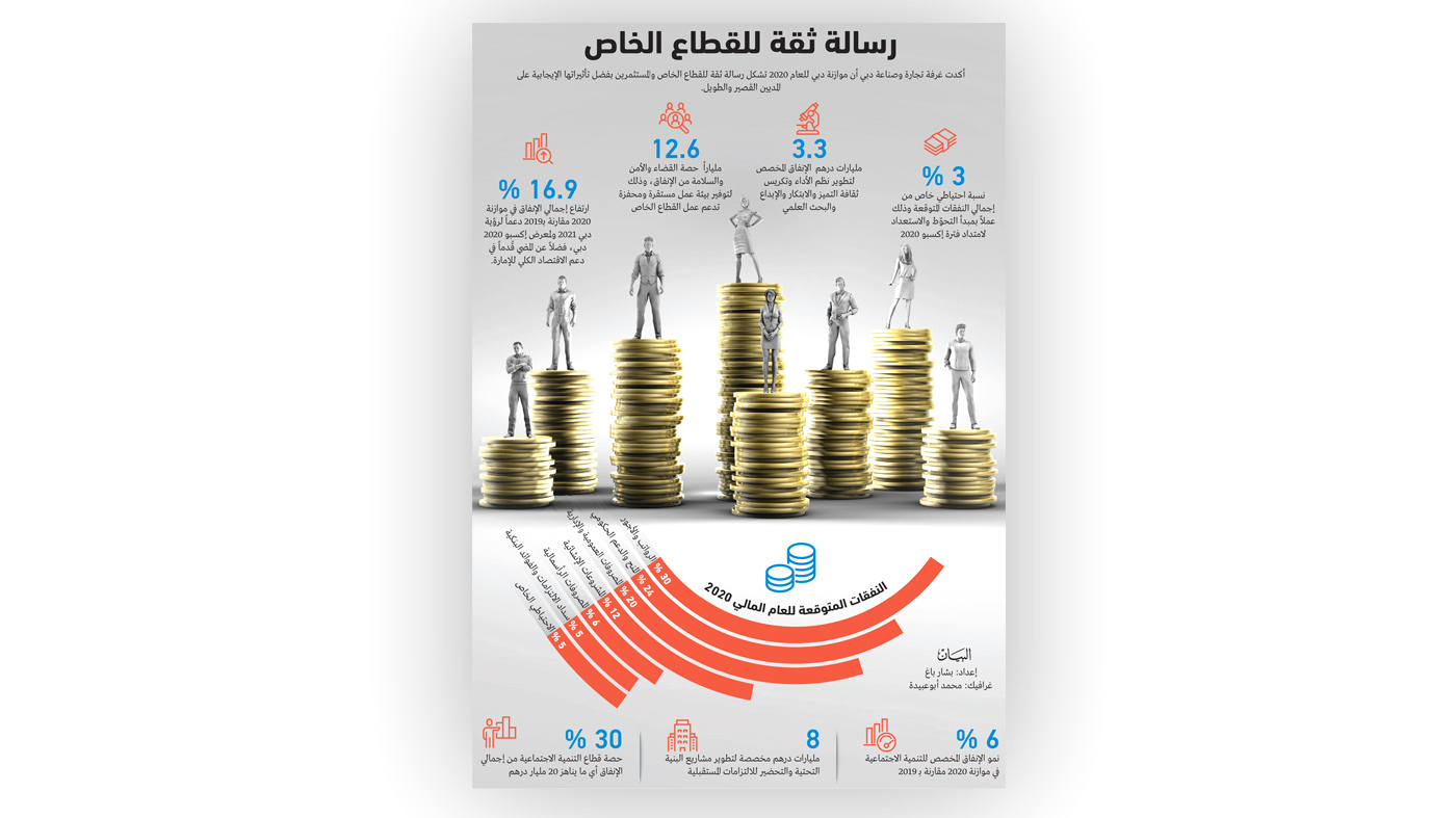 وخصصت موازنة دبي المالية للعام 2020 مبلغ 8 مليارات درهم، أي ما يعادل 12% من نفقات الحكومة الكلية لتطوير مشاريع البنية التحتية، والتحضير للالتزامات المستقبلية. ويدل إنفاق الحكومة المستمر على مشاريع البنية التحتية على استمرارها في شراء السلع والخدمات من القطاع الخاص، حيث من المتوقع أن تكون قطاعات البناء والعقارات والتمويل والتشييد وإدارة المرافق، وغيرها من قطاعات الخدمات المهنية ذات الصلة الأكثر استفادة من هذا التوجه.