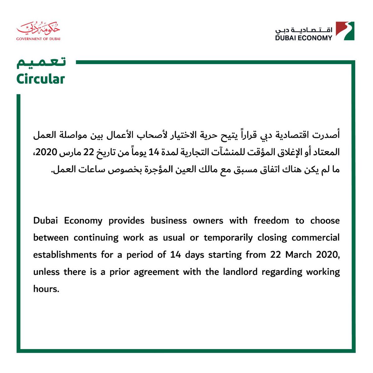 أصدرت اقتصادية دبي قرارا يتيح الاختيار لأصحاب الأعمال بين مواصلة العمل المعتاد أو الإغلاق المؤقت للمنشآت التجارية لمدة 14 يوما من تاريخ 22 مارس 2020 ما لم يكن هناك اتفاق مسبق مع مالك العين المؤجرة بخصوص ساعات العمل.