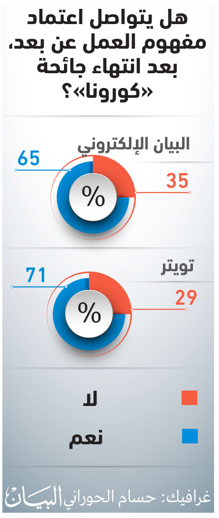 ولم تختلف نتائج الاستطلاع ذاته على حساب البيان في موقعها الإلكتروني، إذ ذهب 65% من المشاركين إلى الاعتقاد بأن العمل عن بعد يمكن أن يتواصل بعد تعافي الأعمال من آثار «كورونا»، فيما جزم 35% بأن العمل عن بعد كان وسيلة وإجراء طارئاً فرضته الجائحة ولا يمكن تمريره ليصبح أسلوب عمل دائم.
