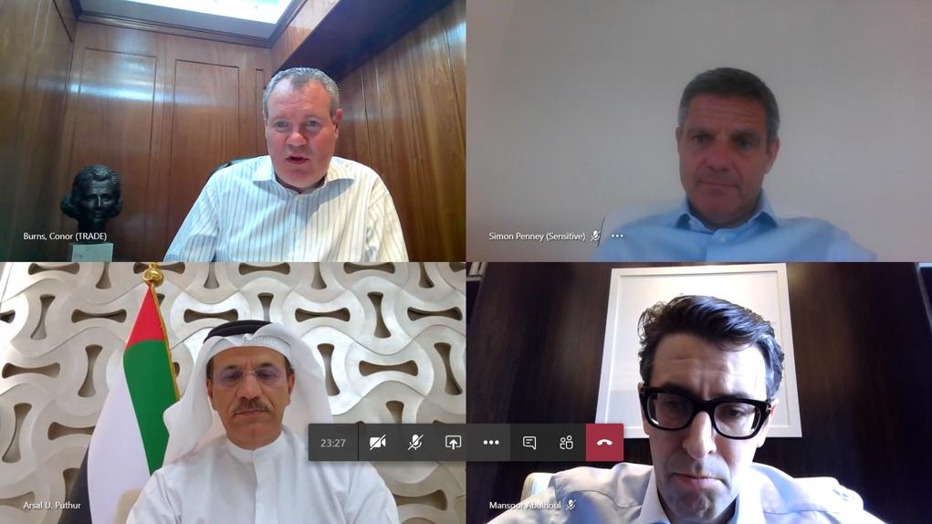 جاء ذلك خلال اجتماع عقد عن بعد عبر الاتصال المرئي، بمشاركة منصور بالهول سفير  الإمارات لدى المملكة المتحدة، والمهندس محمد أحمد بن عبد العزيز الشحي وكيل وزارة الاقتصاد للشؤون الاقتصادية، وعبد الله بن أحمد آل صالح وكيل الوزارة لشؤون التجارة الخارجية، وسيمون بيني المفوض التجاري البريطاني.