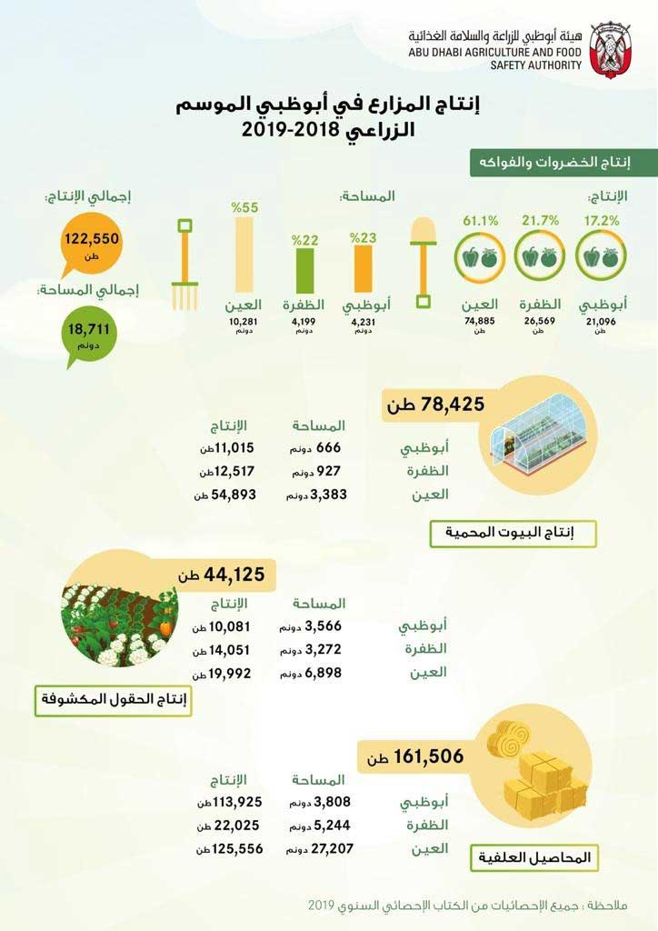 ثم أخيراً مزارع أبوظبي التي أنتجت نحو 21 ألفاً و96 طناً بنسبة 17.2% من إجمالي الإنتاج وبمساحة إجمالية قدرت بنحو 4 آلاف و231 دونماً بنسبة 23% من إجمالي المساحة المزروعة في أبوظبي.