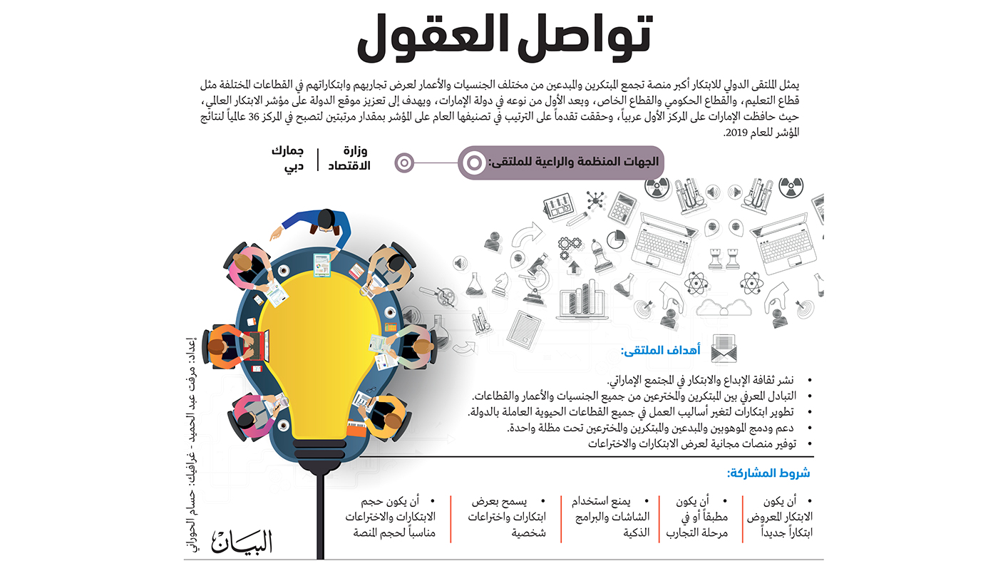 كشف حسين الفردان، مدير مركز الابتكار في جمارك دبي، عن عزم الدائرة إطلاق الملتقى الدولي الثاني للابتكار في فبراير من العام المقبل 2021، تزامناً مع شهر الإمارات للابتكار خلال أسبوع دبي للابتكار وذلك بالتعاون مع وزارة الاقتصاد، حيث يمثل الملتقى أكبر منصة تجمع المبتكرين والمبدعين من مختلف الجنسيات والأعمار لعرض تجاربهم وابتكاراتهم في القطاعات المختلفة مثل قطاع التعليم، والقطاع الحكومي، القطاع الخاص. وأفاد بأن أكثر من 500 طالب وطالبة شاركوا في ملتقى الابتكار الدولي الأول الذي نظمته الجمارك في أسبوع دبي للابتكار الشهر الماضي، وجرى تبادل معرفي بين أكثر من 100 عارض، كما شارك فيه أكثر من 20 دولة، فيما تراوحت أعمار المشاركين من 5 سنوات إلى 85 عاماً.