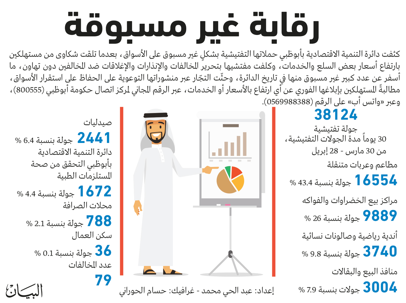 أسفرت الحملات التفتيشية غير المسبوقة التي شنّها مفتشو دائرة التنمية الاقتصادية بأبوظبي، على أسواق الإمارة، منذ نهاية مارس الماضي، إلى انضباط الأسواق، وهو ما ظهر أخيراً في تراجع المخالفات والإنذارات والإغلاقات.