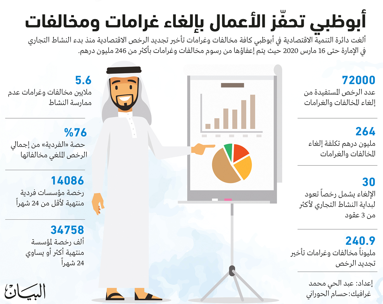 ألغت دائرة التنمية الاقتصادية في أبوظبي كافة مخالفات وغرامات تأخير تجديد الرخص الاقتصادية بكافة أشكالها القانونية حتى 16 مارس 2020، وشملت أكثر من 72 ألف رخصة بقيمة تجاوز 246 مليون درهم.