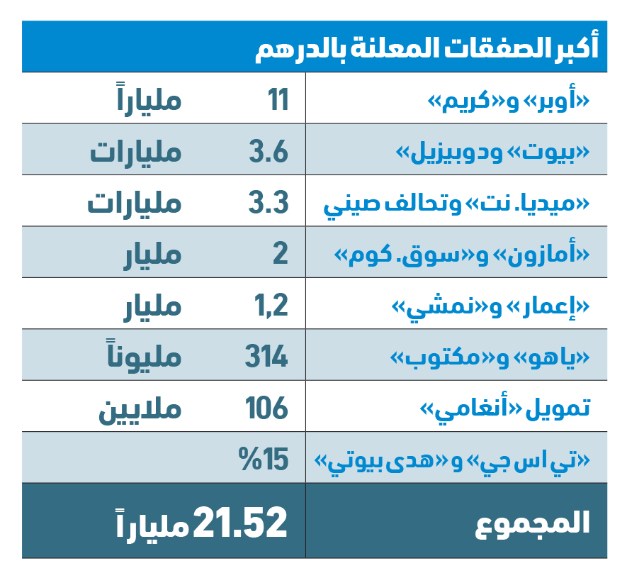 سبقها استحواذ «أوبر» على «كريم» بـ11 مليار درهم، و«أمازون» على «سوق. كوم» بملياري درهم، وتحالف صيني على «ميديا. نت»، بـ 3.3 مليار درهم وشركة «إعمار» على «نمشي» بصفقة قيمتها 1.2 مليار درهم و«ياهو» على «مكتوب. كوم» بـ 314 مليون درهم، وتمويل لشركة «أنغامي» بنحو 1.6 مليون درهم، وغيرها.