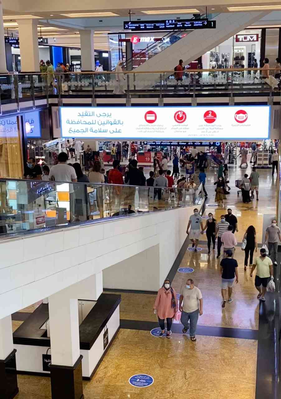 كما تحرص المراكز التجارية، بكل ما تضمه من متاجر ومنافذ بيع، على التزام جميع العاملين والزوار بالتعليمات الوقائية، ومن أهمها، ارتداء الكمامات والحفاظ على التباعد المكاني بين الأشخاص، والمسافة الآمنة التي يجب ألا تقل عن مترين، وكذلك استخدام المعقمات.