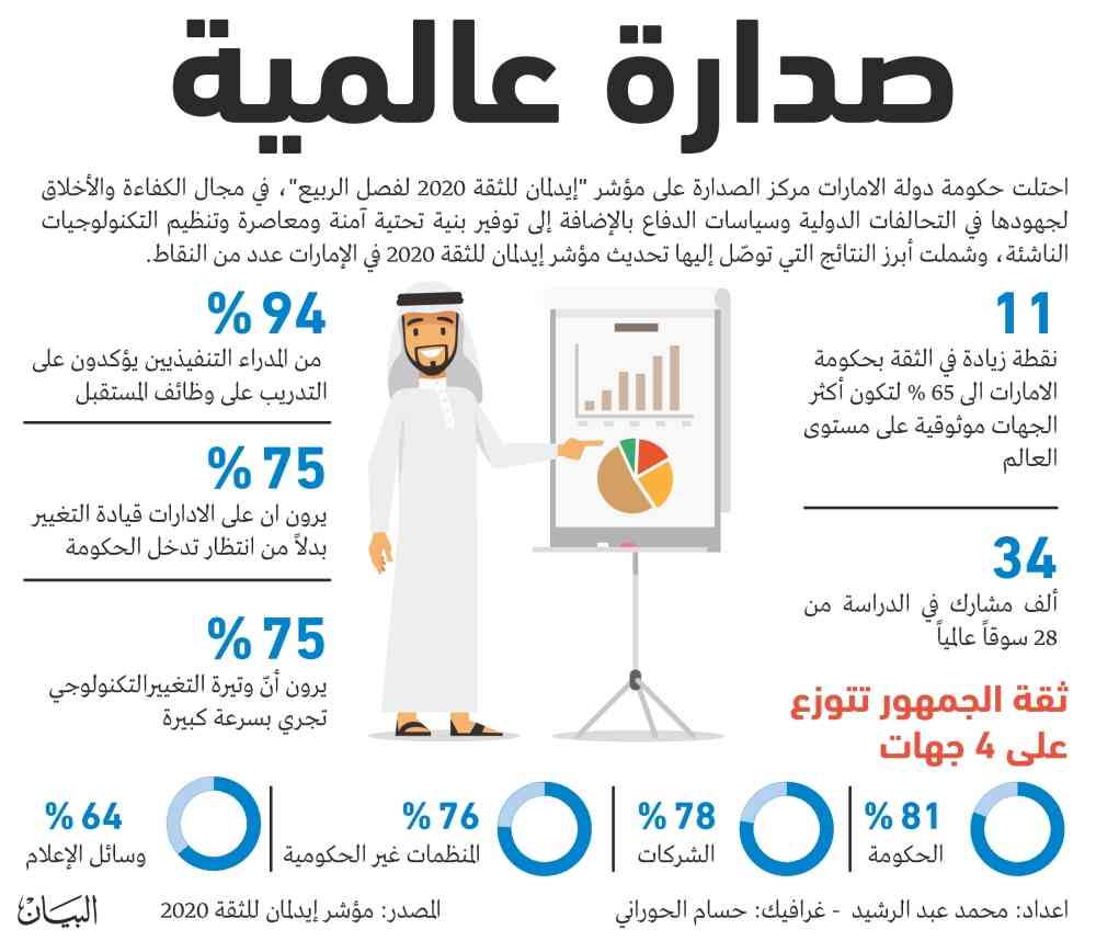 أظهر مؤشر «إيدلمان للثقة 2020 لفصل الربيع» أن جائحة «كورونا»، «كوفيد-19» ساهمت في تعزيز الثقة بحكومة دولة الإمارات، فارتفعت بمعدل 11 نقطة لتصل إلى أعلى مستوياتها وتبلغ 65 % لتكون أكثر الجهات موثوقية على مستوى العالم وللمرة الأولى منذ إطلاق الدراسة قبل 20 عاماً.
