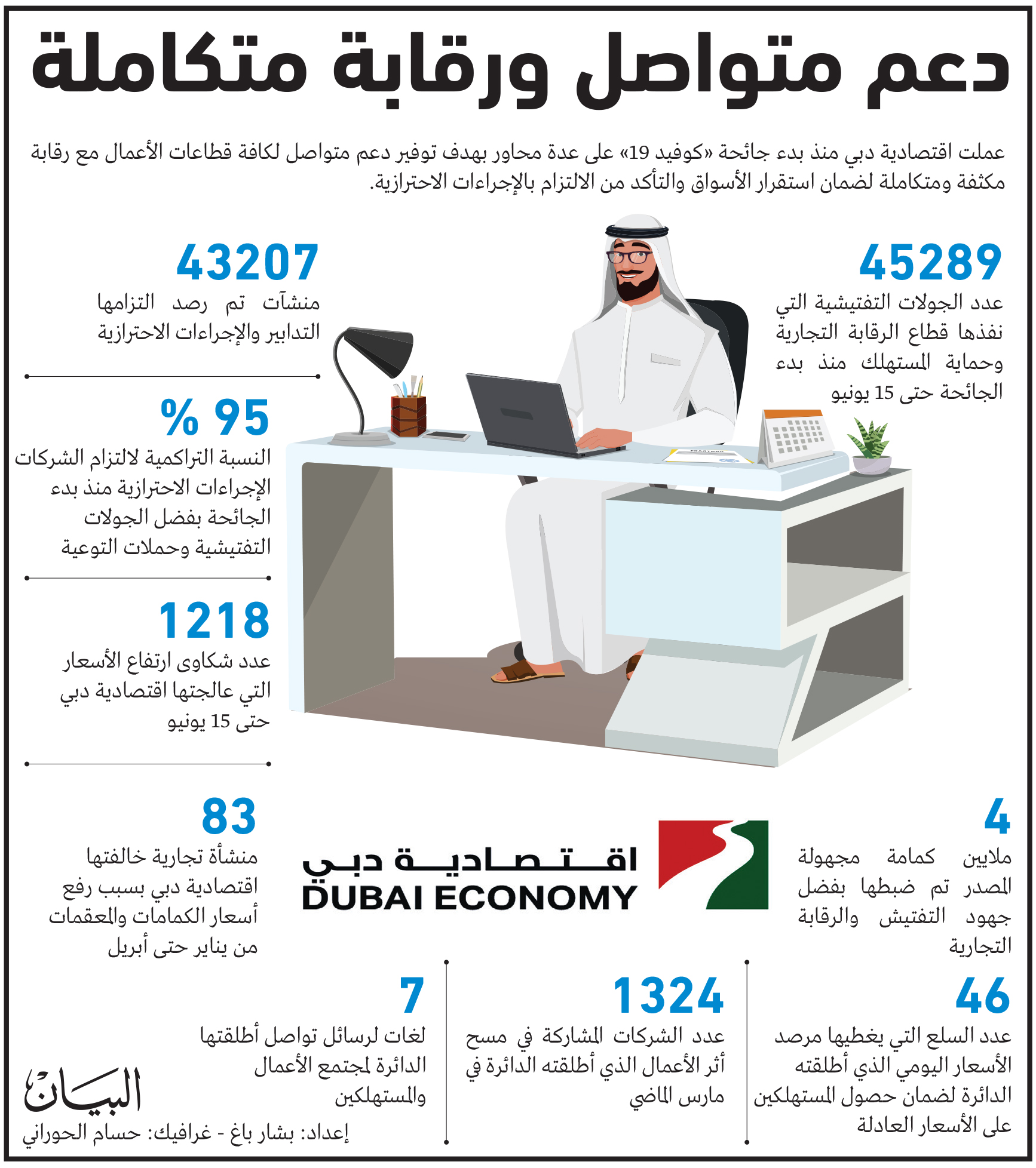 وانعكست الرسالة واللفتة المميزة من سموه، إيجاباً، على رفع الروح المعنوية لفريق المفتشين الميدانيين في الأسواق، الذين يبذلون جهوداً كبيرة في تعزيز التزام مجتمع الأعمال وجمهور المستهلكين، بالتدابير والإجراءات الاحترازية، الرامية إلى الحد من تفشي فيروس «كورونا» «كوفيد 19»، وقد بلغ عدد الجولات التفتيشية التي نفذها قطاع الرقابة التجارية وحماية المستهلك، حوالي 45,289 جولة منذ بدء الجائحة، حتى 15 يونيو الجاري. وقد أسهمت الجولات التفتيشية وحملات التوعية، في تحقيق نسبة التزام تراكمية عالية من قبل الشركات، منذ بدء جائحة «كورونا»، وصلت إلى 95 %، إذ بلغ عدد المنشآت التجارية المستوفية للتدابير والإجراءات الاحترازية 43,207 منشآت.