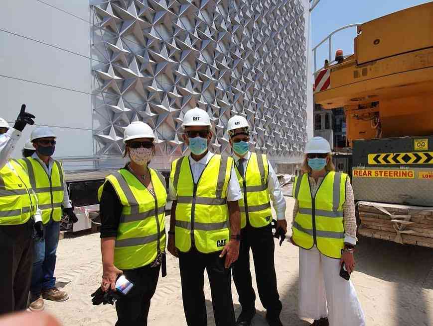 ونشر حساب توتير الرسمي الخاص بالبعثة الدبلوماسية للولايات المتحدة في الإمارات صورا لزيارة الوفد الذي اطلع على تقدم العمليات الانشائية في الجناح بما فيها الجدار الخارجي الذي تكسيه النجوم.