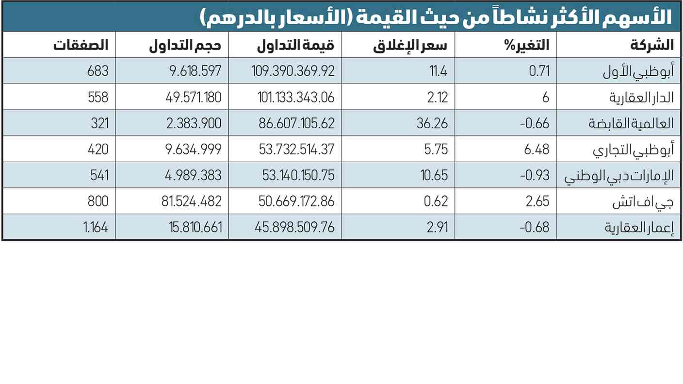 واستقطبت الأسهم سيولة بنحو 807 ملايين درهم موزعة بواقع 493.6 مليوناً في أبوظبي و313.38 مليوناً في دبي، وجرى تداول 524.2 مليون سهم منها 187.7 مليوناً في أبوظبي و336.4 مليوناً في دبي، من خلال 8465 صفقة. واستحوذت 7 أسهم على نحو 62% من السيولة الإجمالية أو ما يعادل نصف مليار درهم وهي «أبوظبي الأول» و«الدار» و«العالمية القابضة» و«أبوظبي التجاري» و«الإمارات دبي الوطني» و«جي اف اتش» و«إعمار العقارية».