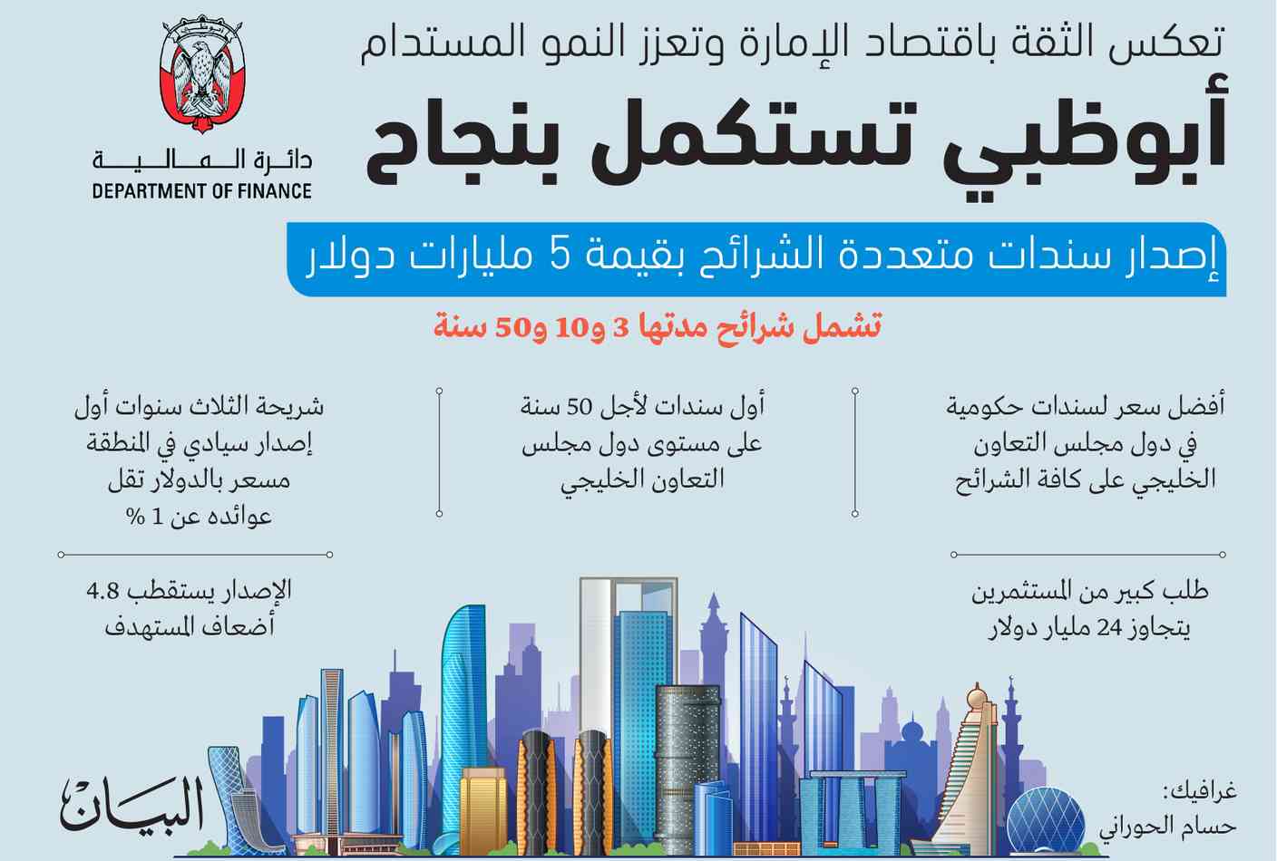 أعلنت إمارة أبوظبي عن إكمالها بنجاح طرح سندات سيادية متعددة الشرائح بقيمة 5 مليارات دولار أمس، ما يعكس مواصلة التزامها بتعزيز الاستدامة المالية.