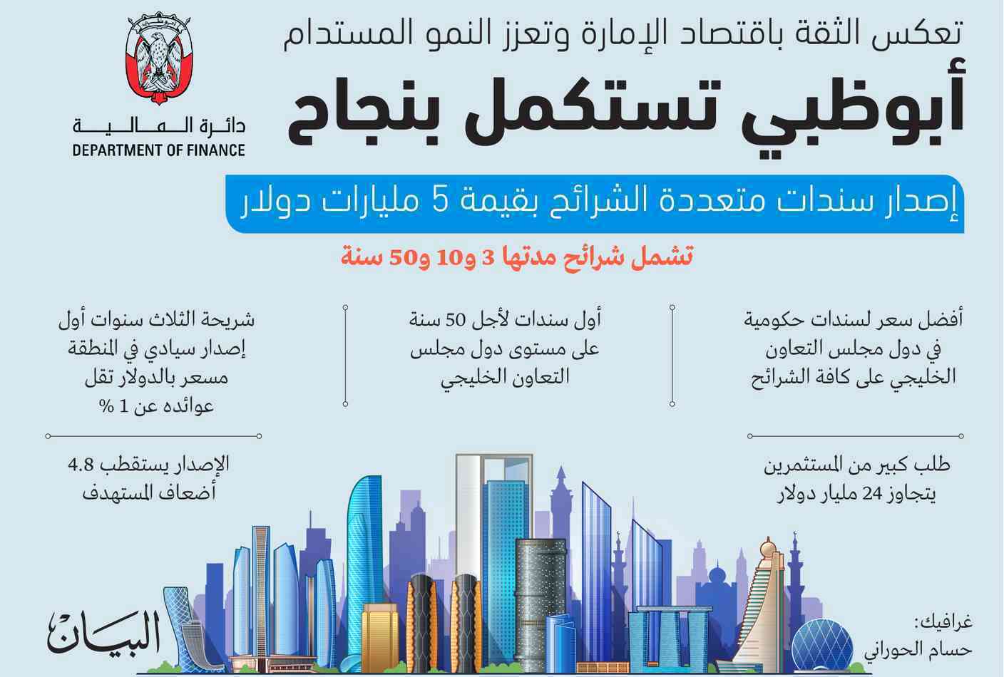 وتجاوزت طلبات الاكتتاب على السندات 4.8 أضعاف الحجم المطلوب، حيث تلقت طلبات من 60 جهة جديدة، وبلغ حجم الطلبات 24 مليار دولار. وقال بيان للدائرة المالية إنه بالاعتماد على الطلب الكبير الذي أبداه المستثمرون، تم تسعير السندات بعوائد منخفضة تاريخياً.