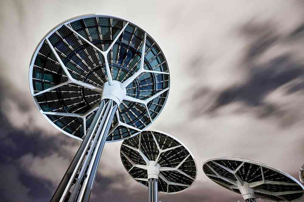 وأظهرت صور حديثة، تنشر للمرة الأولى، اكتمال الهيكل الخارجي للجناح، فيما تحيط به «أشجار الطاقة»، وهي أعمدة يغطي كل منها صحن فضائي بيضوي، يضم ألواحاً لتوليد الطاقة الشمسية، ويتحرك الصحن لتتبع أشعة الشمس خلال اليوم، بما يحاكي أزهار دوار الشمس، التي تسمى أيضاً عباد الشمس.