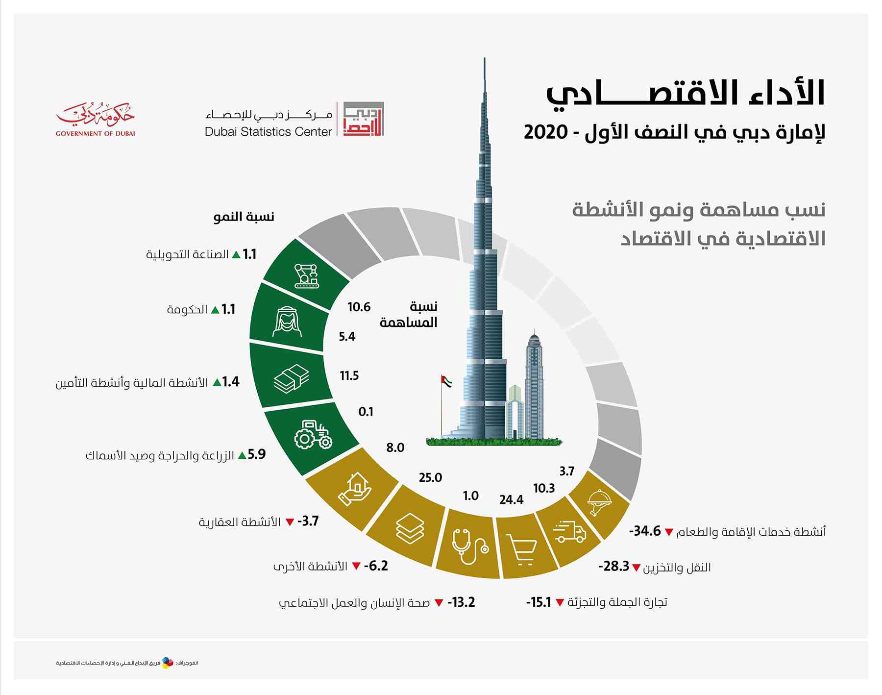 أظهرت التقارير الأولية الصادرة عن مركز دبي للإحصاء تراجع اقتصاد الإمارة بنسبة 10.8% في النصف الأول من عام 2020 وفي هذا الإطار قال عارف المهيري، المدير التنفيذي لمركز دبي للإحصاء، "أن نسبة التراجع تأتي ضمن المدى الطبيعي المتوقع للتراجع الاقتصادي في ظل التداعيات الكبيرة التي افرزتها الجائحة على العالم أجمع، وخصوصاً في الاشهر الستة الأولى من العام، ويعود هذا التراجع الطبيعي بالدرجة الأولى إلى فترة التعقيم الوطني حيث اتجهت الأولوية الاستراتيجية نحو مكافحة الجائحة والحفاظ على أرواح الناس وصحة وسلامة المجتمع من خلال اتخاذ عدد من الإجراءات الصارمة كما حدث في مختلف دول العالم مثل الحد من التجول وإغلاق المنافذ والتي كان من المتوقع أن تلقي بظلالها على الحركة الاقتصادية.