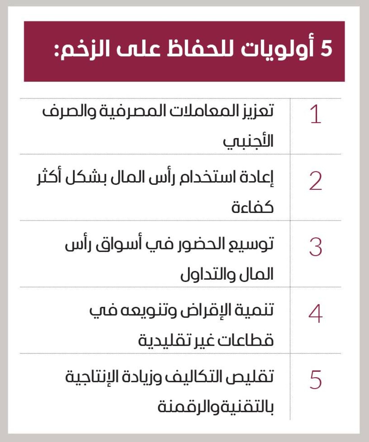 وحدد التقرير خمس أولويات رئيسة للمحافظة على الزخم وضمان استمرار نجاح أداء البنوك الخليجية في المستقبل، تتمثل في: تعزيز المعاملات المصرفية والصرف الأجنبي، وإعادة استخدام رأس المال بشكل أكثر كفاءة، وتوسيع الحضور في أسواق رأس المال والتداول، وتنمية الإقراض وتنويعه في قطاعات غير تقليدية، وتقليص التكاليف وزيادة الإنتاجية بالتقنية والرقمنة.