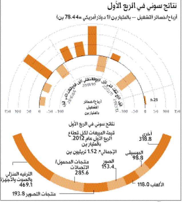 وقالت سوني إنها سجلت أرباح تشغيل بقيمة 6.58 مليارات ين في الربع الأول من هذا العام مقابل 27.5 مليارا في الفترة نفسها قبل عام، بينما زادت مبيعاتها بنسبة 1.4% إلى 1.52 تريليون ين.