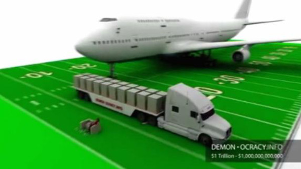 ولتقريب الصورة إلى الأذهان فإن حسبة بسيطة تبين أن التريليون دولار أميركي لو توفرت على شكل سيولة في مكان واحد من العالم، فإنها بحاجة إلى مليون حقيبة سفر على اعتبار أن الحقيبة الواحدة تضم مليون دولار، أو أن التريليون الواحد تحتاج لمساحة تعادل ملعباً لكرة القدم من أجل تصفيفها وترتيبها على شكل ربطات، وكل ربطة تضم أوراقاً من فئة المئة دولار.