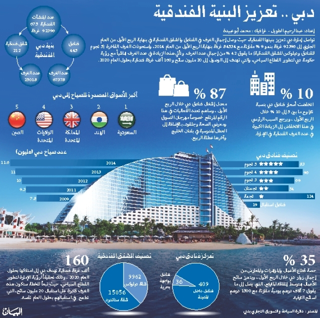 أكدت دائرة السياحة والتسويق التجاري في دبي أن عدد الغرفة الفندقية في الإمارة قد ازداد بنسبة 9.2% العام الماضي، ففي مطلع 2014، بلغ عدد الغرف الفندقية في الإمارة 84534 غرفة ضمن 611 فندقاً وشقة فندقية، وفي نهاية 2014 بلغ عدد الغرف الفندقية في الإمارة 92333 غرفة ضمن 657 فندقاً وشقة فندقية، ما يدل على النمو الإيجابي والمستدام الذي يشهده قطاع الضيافة.