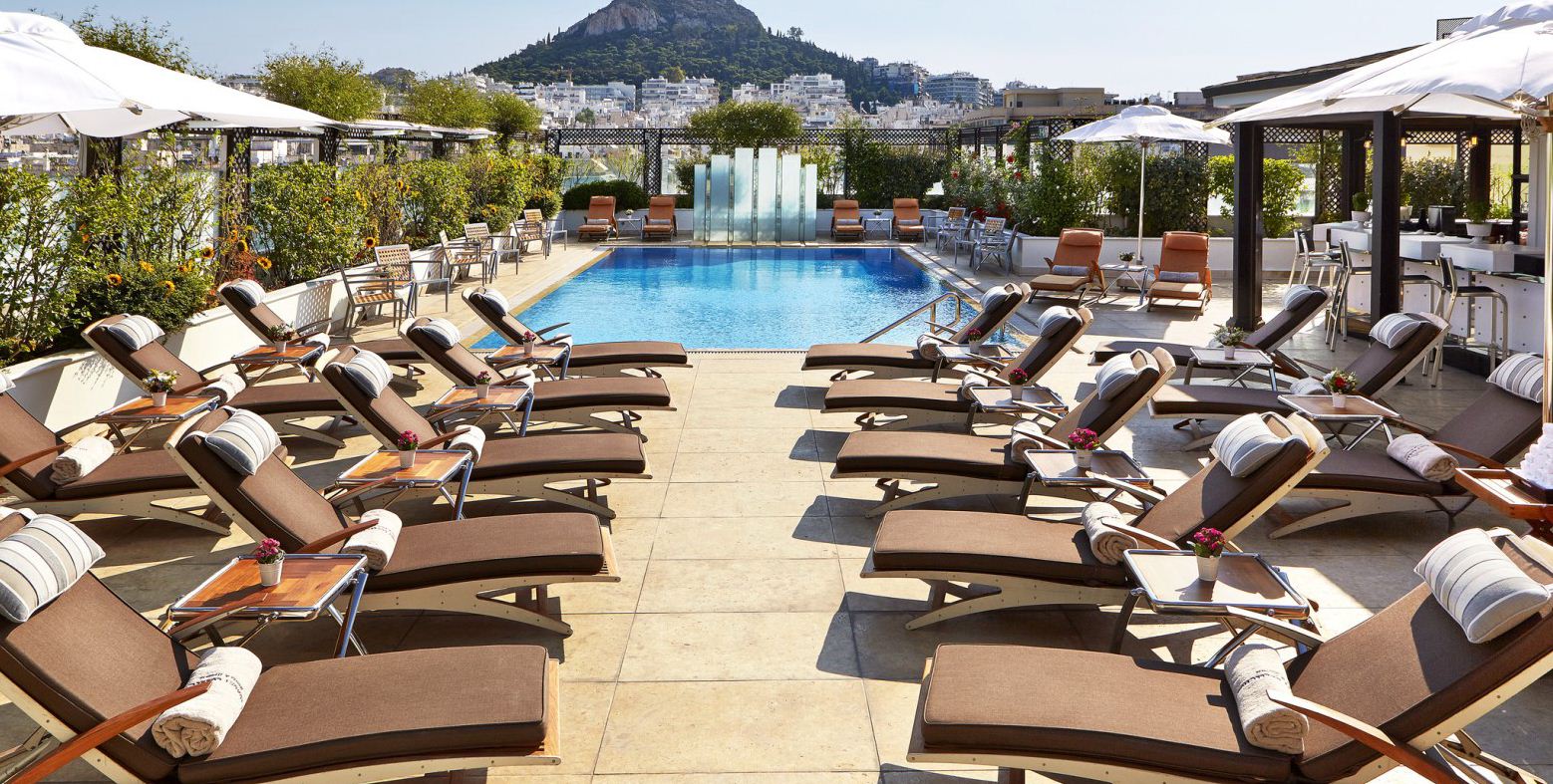 وتقع منطقة حمام السباحة الداخلي البالغ مساحتها 65 متر مربع داخل النادي الصحي، وتتميز بأجوائها التي تبعث على الراحة والهدوء، حيث تمتزج ألوان بحر إيجة بالتصميم الأنيق في أسلوب يتسم باللمسات العصرية التي لا يزال بإمكانها أن تُشعرك بالروح الكلاسيكية للحمامات في روما القديمة. واستكشف حمام السباحة الداخلي الدافئ بدرجة الحرارة المثلى على مدار العام ومياهه الفيروزية العميقة التي تنعكس بروعة على الجدران والأرضيات الرخامية البيضاء. أما حمام السباحة الخارجي البالغ مساحته 50 متر مربع في الطابق السابع، فيؤمن ملاذًا منعشًا من شمس الصيف في أثينا. ونظر لتميزه بإطلالات خلفية مثالية لتلّ «ليكابيتوس»، فسيكون من الصعب تحديد أيهما يُشعرك أكثر بالمتعة والسرور: المياه المنعشة أم الإطلالات الخلابة. وفي الأشهر الأكثر دفئًا، يقدم المشرب بجوار حمام السباحة عصائر فواكه طازجة وأطباق خفيفة لتستمتع بتناولها وسط عدد كبير من الزهور العطرة وأشجار السرو. وهو مفتوح من شهر أبريل إلى أكتوبر.