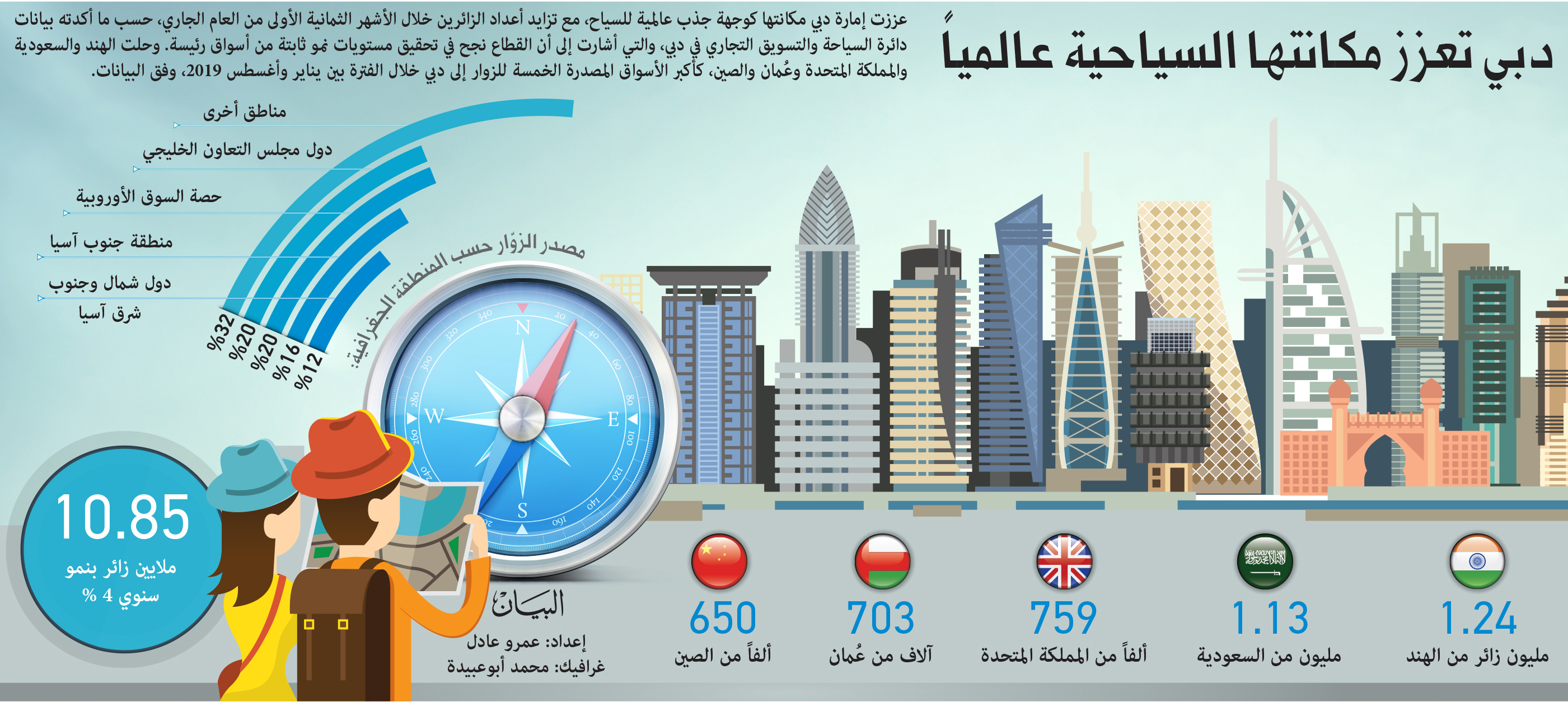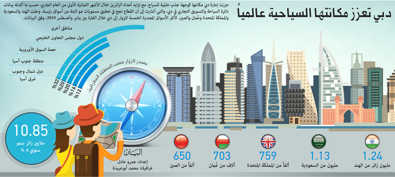 وحلت الهند والسعودية والمملكة المتحدة وعُمان والصين، كأكبر الأسواق المصدرة الخمسة للزوار إلى دبي خلال الفترة بين يناير وأغسطس 2019، وفق البيانات.