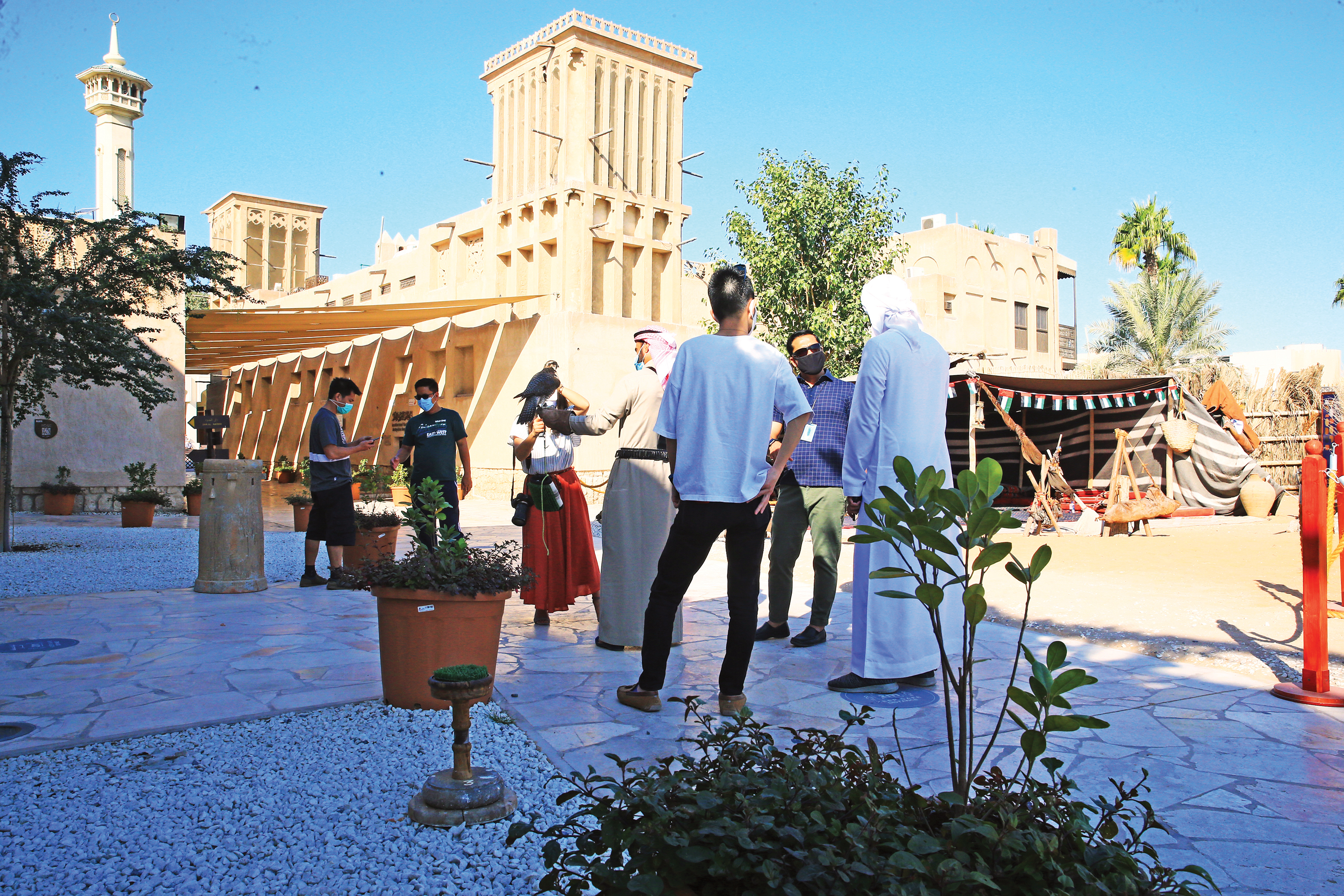 الهدوء يغلف أزقة الحي، لا يكسر حدته سوى أصوات خطوات السياح، ونقرات كاميراتهم التي يحفظون بذاكرتها صوراً تفيض بلحظات جميلة قضوها في أحضان الماضي، وهم يتنقلون من بيت لآخر، لم تترك خاوية بعد أن غادرها أصحابها، وإنما تحولت إلى متاحف، ومزارات تحفظ بين جدرانها شيئاً من تراث الدولة، وأكوام من البخور والهدايا التي تحمل على صدورها صوراً من دبي، يتسابق عليها السياح وزوار المكان، حيث الجميع يود الاحتفاظ بشيء من رائحة المكان، الذي يحتضن «خنجر المغفور له الشيخ زايد بن سلطان آل نهيان، طيب الله ثراه»، وغيرها من الخناجر العربية، التي تشكل جزءاً من التقاليد الإماراتية، والتي حفظت في علب زجاجية، تتخذ من متحف «بيت الخنير» مقراً لها، والذي ما إن تلج بوابته الصغيرة، حتى تحظى بتجربة ثقافية مذهلة، حيث المتحف لا يقتصر فقط على عرض الخناجر، وإنما على رموز تراثية، وصور تاريخية تمثل أجيالاً عديدة من حكام الإمارات ومواطنيها، وهم يتباهون بحمل الخناجر التي تشكل جزءاً أساسياً من لباسهم التقليدي.