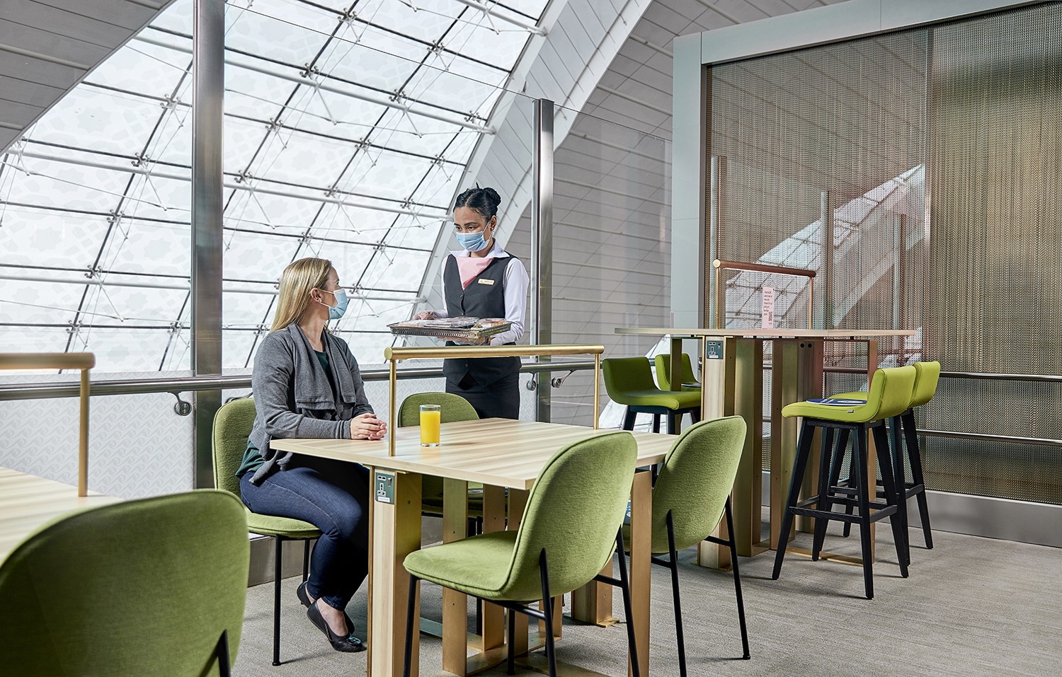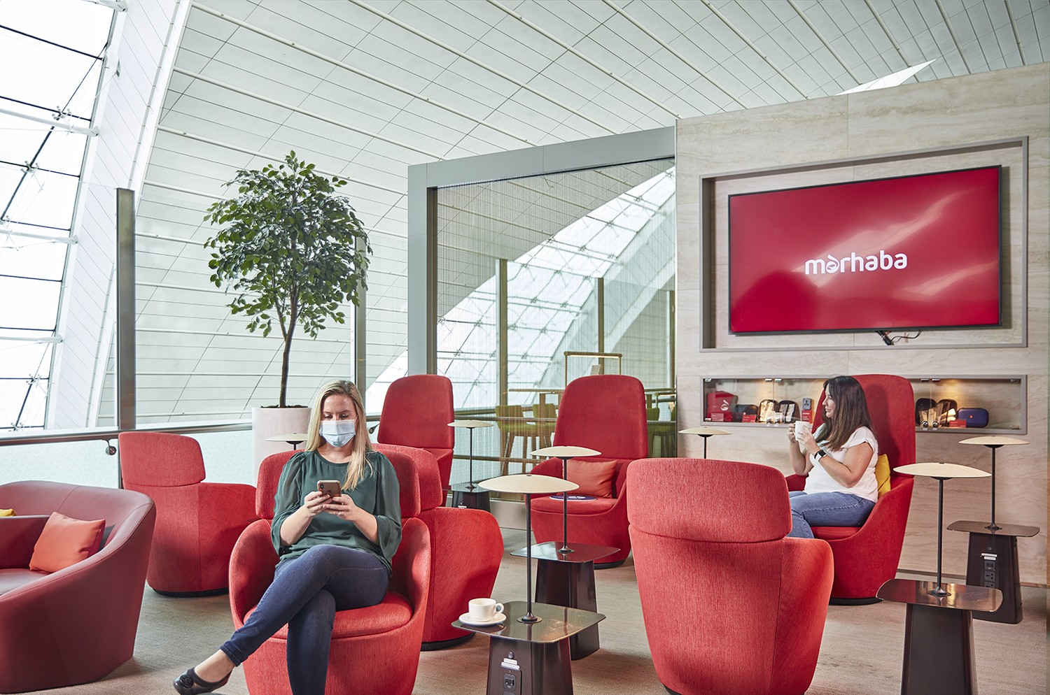 - منطقة تناول الطعام: تشكل تجربة الضيافة العربية جانباً مهماً من خدمات "مرحبا". وتقع منطقة تناول الطعام وسط الصالة وتقدم للعملاء المأكولات والمرطبات ليلاً أو نهاراً. وتتوفر مجموعة متنوعة من خيارات الطاولات، بدءاً من طاولات الطعام والمقاعد الكبيرة وصولاً إلى الأكشاك الأصغر حجماً، وهي مثالية للعائلات.