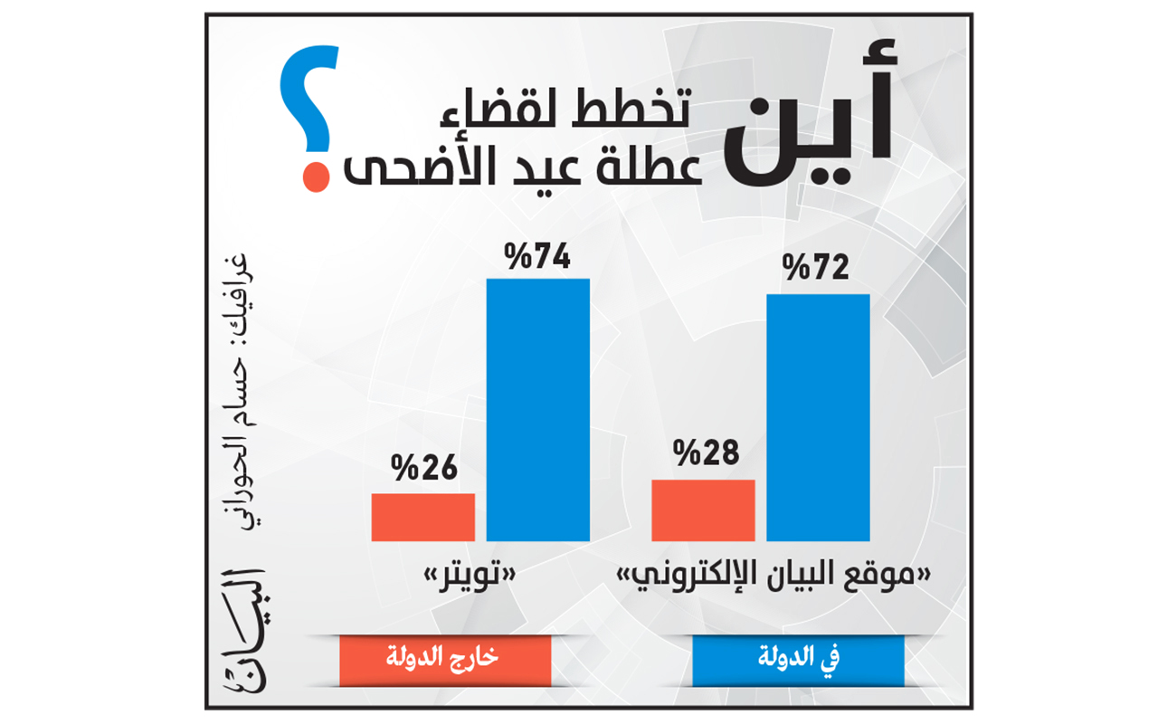 ورداً على سؤال الاستطلاع «أين تخطط لقضاء عطلة عيد الأضحى المبارك؟»، أبدى 72% من المشاركين على موقع «البيان الإلكتروني» تفضيلهم قضاء عطلة عيد الأضحى في الدولة، بينما أعرب 28% عن تخطيطهم لقضائها خارج الدولة.