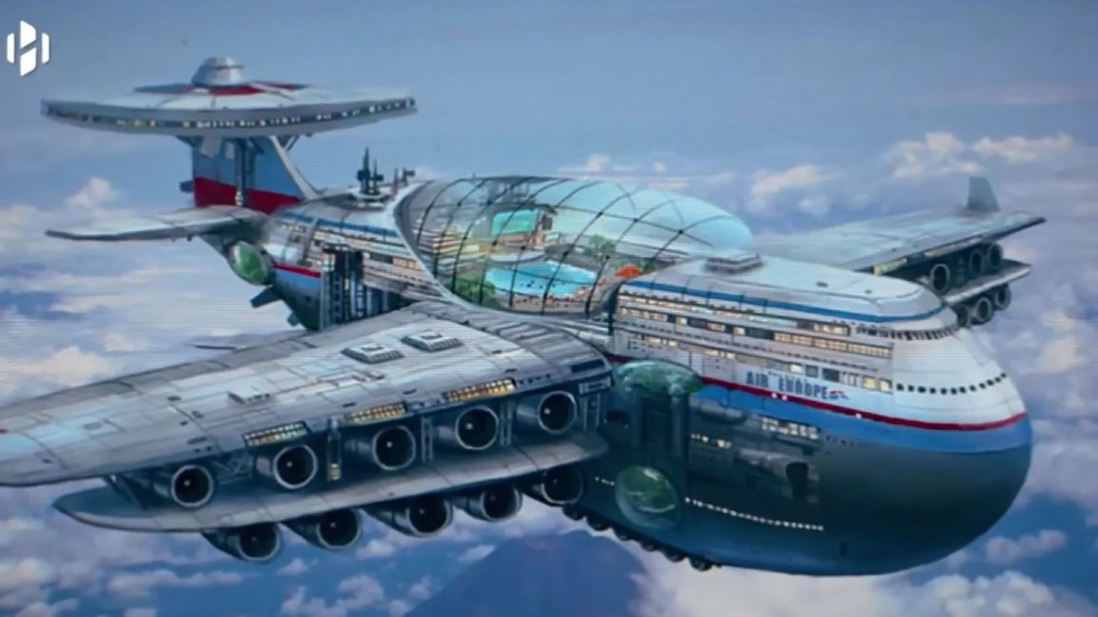 انتشر فيديو على وسائل التواصل الاجتماعي يظهر تصميما لفندق طائر فاخر من المستقبل يتسع لاستقبال 5 آلاف شخص، ويعمل بالطاقة النووية وباستطاعته البقاء في السماء سنوات عدة.
