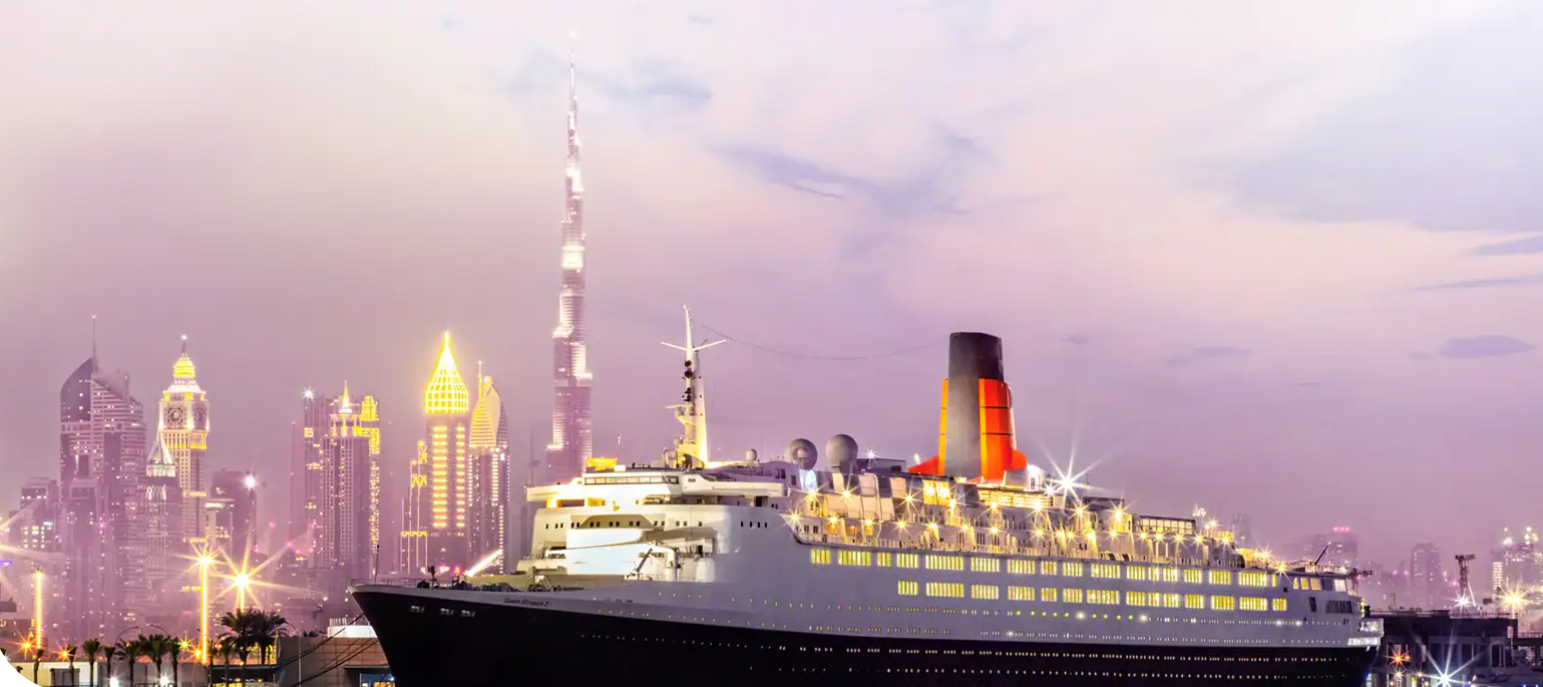 و"الملكة إليزابيث 2" QE2 - أكبر فندق عائم في دبي - أطلقتها ملكة بريطانيا عام 1967، وبدأت رحلتها عبر الأطلسي بعد عامين من إطلاقها، وأكملت 25 رحلة عالمية، عبرت المحيط الأطلسي لأكثر من 806 مرات، وأتمت السفينة آخر رحلاتها يوم 11 نوفمبر 2008 حينما اتجهت من المملكة المتحدة إلى دولة الإمارات .