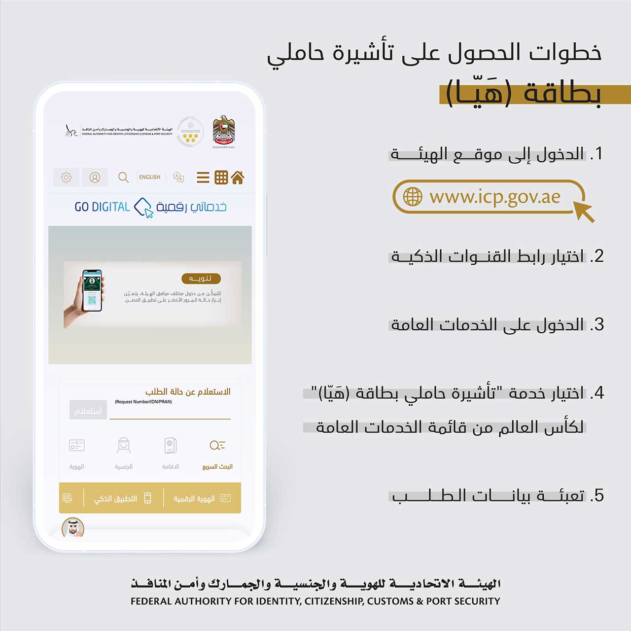 وأوضحت الهيئة أنه يمكن للزوار الدوليين التقديم على "تأشيرة حاملي بطاقة هَيّا" السياحية من خلال الموقع الإلكتروني www.icp.gov.ae .. مشيرة إلى أن التأشيرة يتم إصدارها وفقًا لضوابط منظومة التأشيرات المحدّثة وتتمتع بإمكانية الدخول المتعدد إلى دولة الإمارات خلال مدة 90 يومًا من تاريخ الإصدار وبرسم محدد مقداره 100 درهم فقط، مع إمكانية التجديد لفترة مماثلة عند الطلب، ودون اشتراط ضامن أو إثبات الدخول المسبق إلى دولة قطر.