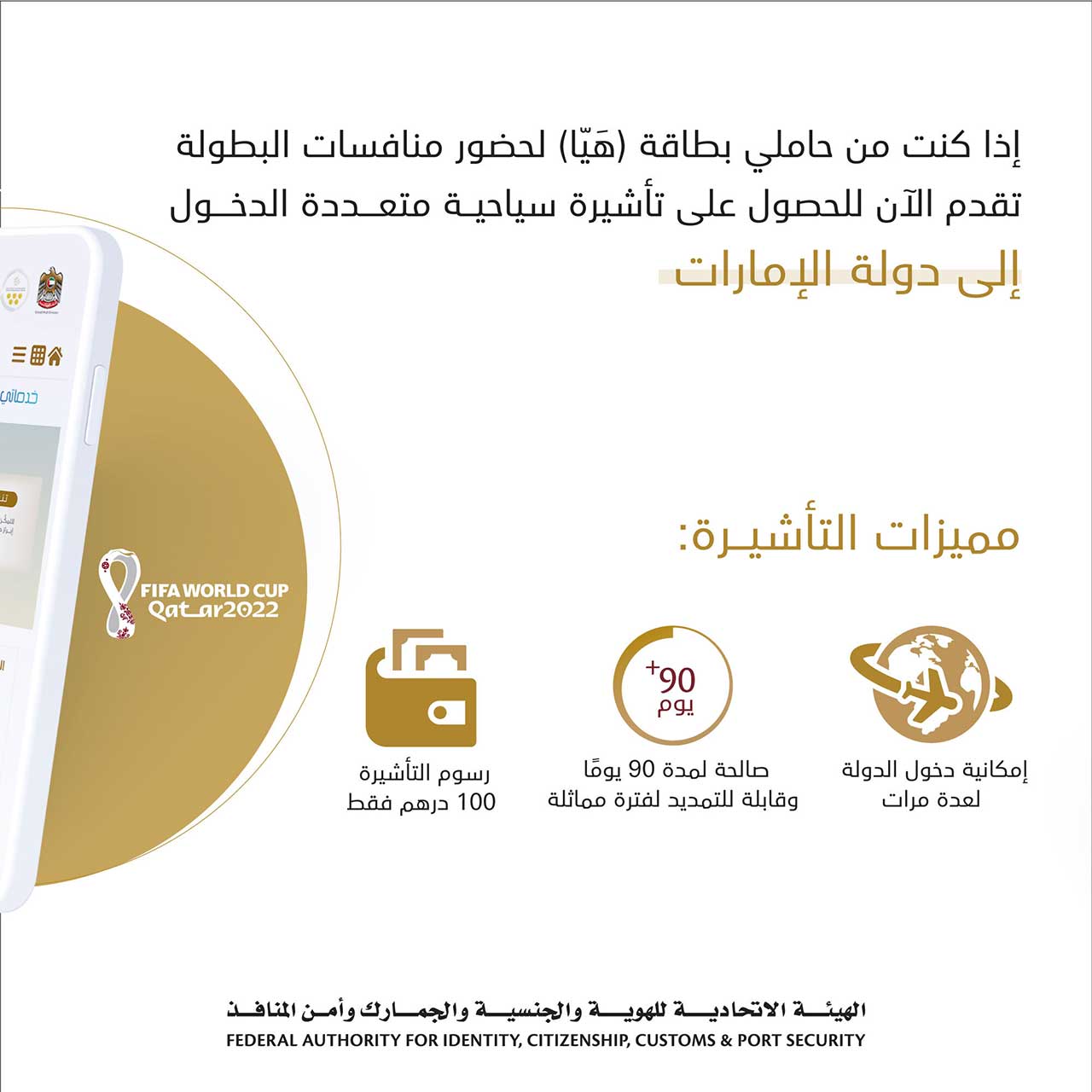 ورحبت الهيئة - في بيان لها - بالمشجعين الدوليين حاملي "بطاقة هَيّا" الصادرة من الجهات المنظمة لبطولة كأس العالم FIFA قطر 2022 لزيارة دولة الإمارات العربية المتحدة طوال فترة انعقاد الحدث المقام في قطر وذلك في إطار دعم حكومة دولة الإمارات لدولة قطر الشقيقة لاستضافة فعاليات ومنافسات بطولة كأس العالم لكرة القدم خلال الفترة من 20 نوفمبر الجاري حتى 18 ديسمبر 2022.
