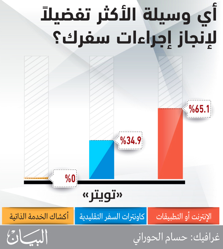 أظهرت نتائج استطلاع «البيان» عبر «تويتر» أن النسبة الأكبر من المشاركين يفضلون حجز رحلات السفر الجوي عبر الإنترنت والتطبيقات الهاتفية الذكية. ورداً على سؤال: «أي وسيلة الأكثر تفضيلاً لإنجاز إجراءات سفرك؟»، اختار 65.1 % الإنترنت أو التطبيقات، فيما اختار 34.9 % كاونترات السفر التقليدية، فيما لم يختر أي من المشاركين أكشاك الخدمة الذاتية لإنجاز إجراءات السفر.