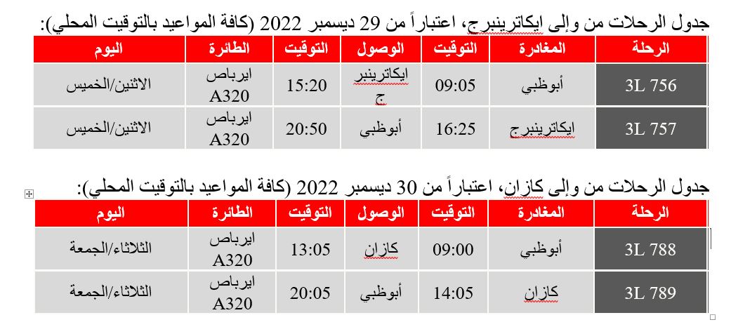 وستربط الرحلات الجديدة المباشرة بين مدينة أبوظبي ومدينتي "كازان" و "ايكاترينبرج" من خلال تسيير رحلتين أسبوعياً إلى كل وجهة انطلاقاً من 29 ديسمبر 2022.