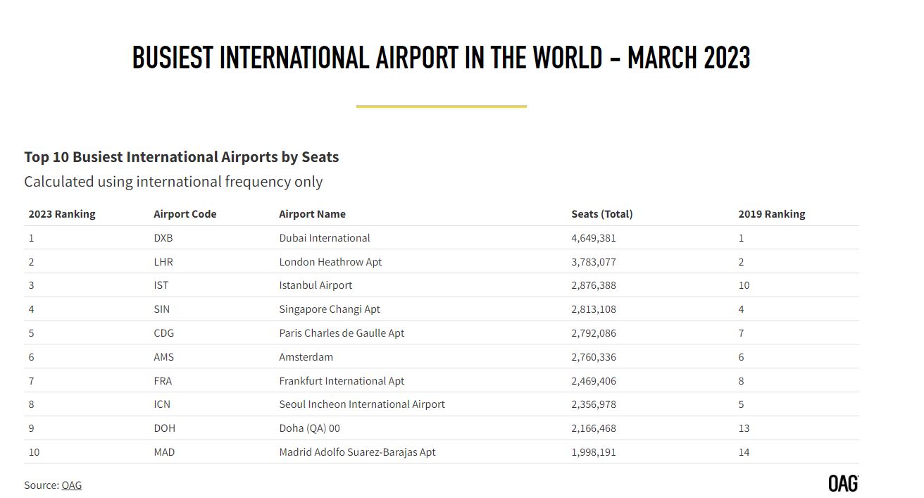 تصدر مطار دبي الدولي قائمة المطارات الأكثر ازدحاماً من حيث حركة الركاب الدوليين، خلال شهر مارس الحالي.