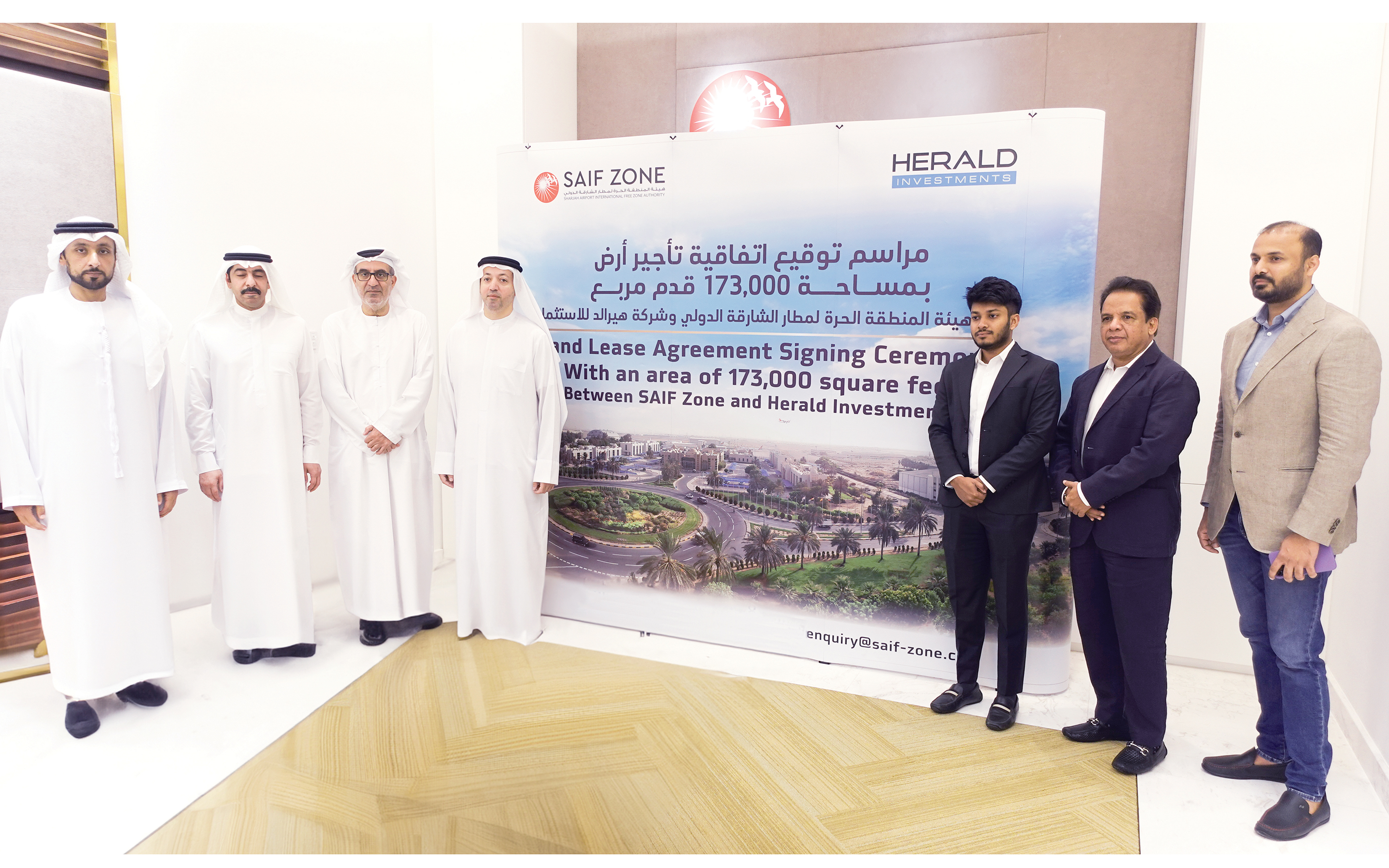 وجاء إعلان التوسعة بموجب اتفاقية جرى توقيعها في مقر الهيئة، من قبل سعود سالم المزروعي، مدير هيئة المنطقة الحرة لمطار الشارقة الدولي، وكريشنا كالادهاران المدير التنفيذي لشركة هيرالد القابضة، بحضور مسؤولين ومدراء من الجانبين، ونصت الاتفاقية على استئجار أرض من المنطقة بمساحة 173 ألف قدم مربع، لتشييد منشأة للخدمات اللوجستية التي تلبي احتياجات العديد من القطاعات مثل الضيافة، والسلع الاستهلاكية، والبناء، والنفط والغاز والمشاريع الثقيلة، من خدمات التخزين، والشحن جواً وبراً وبحراً.